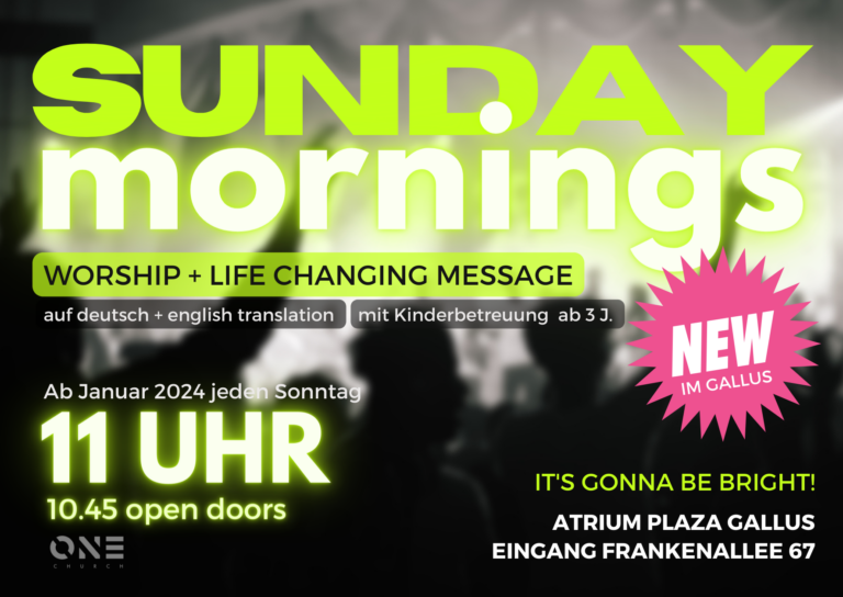 Sunday Mornings: Um 11 Uhr findet unser Gottesdienst statt, bei dem wir gemeinsam Gott begegnen wollen und danach die Gemeinschaft bei Coffee&Connect zusammen genießen. Location: Atrium Plaza, Eingang Frankenallee 67, 60327 Frankfurt a. M.